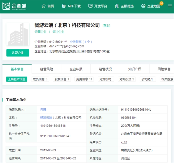 根据企查猫工商信息显示,畅游云端(北京)科技有限公司成立于2013年6月3日,法人代表为冉曦。